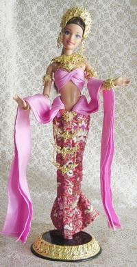 ทำจากตุ๊กตาบาร์บี้แท้ 100% เครื่องประดับ และเครื่องทรงไทย ทำจากทองคำแท้ เสื้อผ้าด้านบนทำจาก ผ้าไหมสีชมพู ทอ 4 เส้น (มีความละเอียดกว่าผ้าไหมทั่วไป ที่ทอเพียง 2 เส้น) ด้านล่างนุ่งผ้าถุงลายดอก ทำด้วยมือทุกขั้นตอน ฝีมือช่างในวัง ความสูงเท่ากับตุ๊กตาบาร์บี้